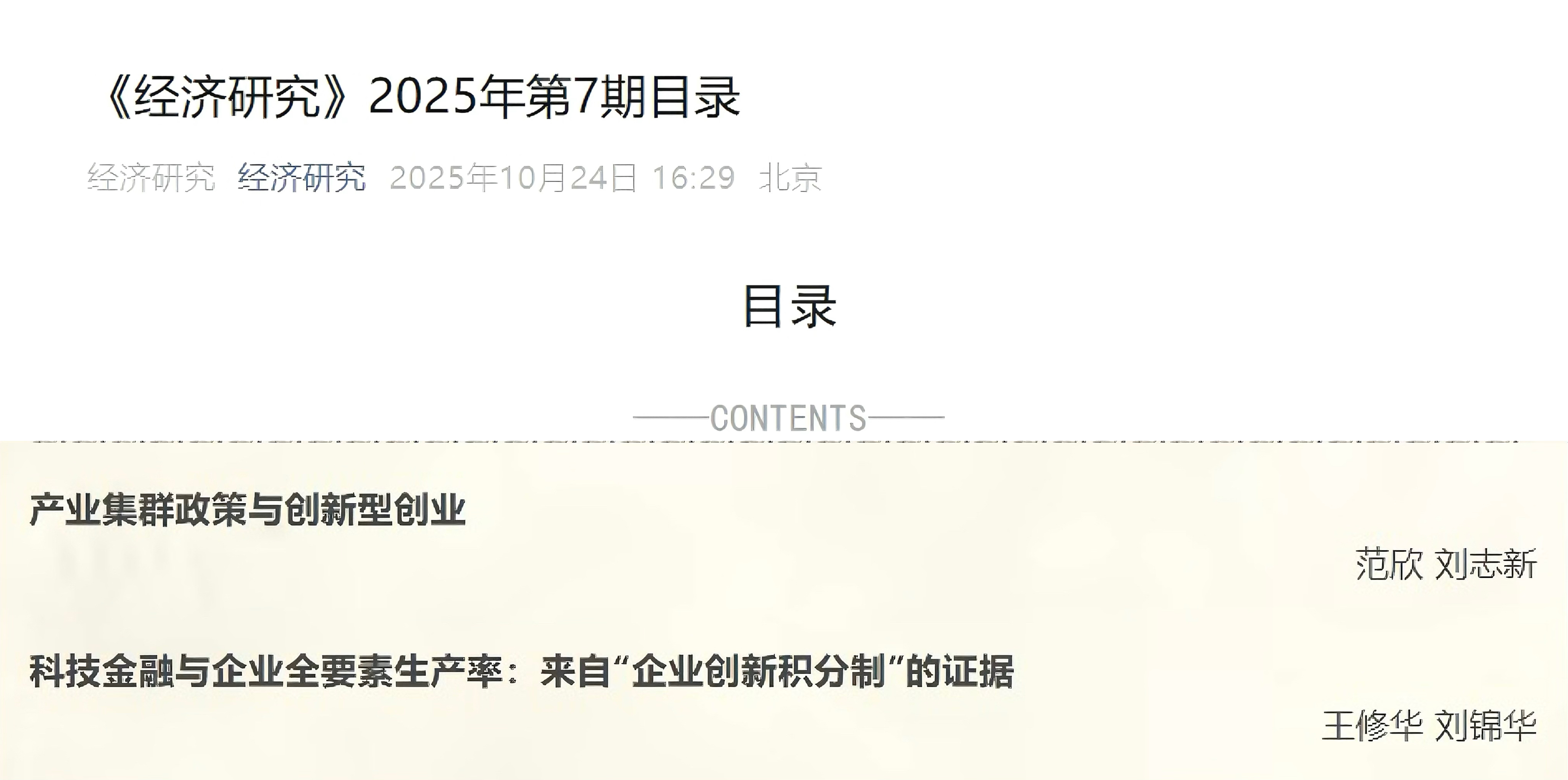 近日,我院应用金融系王修华教授和安徽大学经济学院刘锦华老师(原我院2020级博士研究生)合作的题为“科技金融与企业全要素生产率:来自企业创新积分制的证据”的论文发表在《经济研究》2025年第7期。
