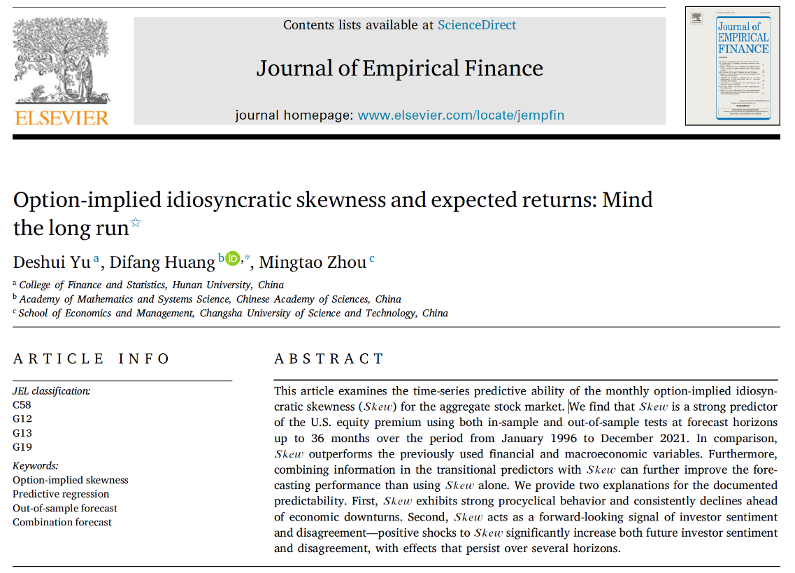 近日,我院金融科技与工程系余得水副教授的论文“Option-implied idiosyncratic skewness and expected returns: Mind the long run”在院定A2类期刊Journal of Empirical Finance,volume 83,September2025发表。