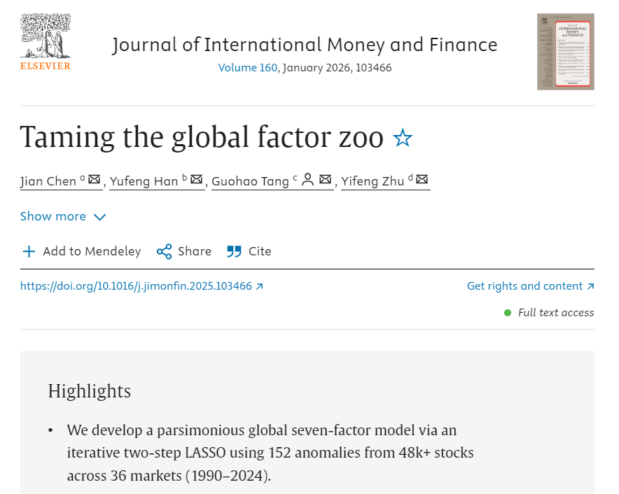 近日,ok1133诸侯快讯金融科技与工程系唐国豪副教授合作的金融人工智能领域类论文“Taming the Global Factor Zoo”发表在《Journal of International Money and Finance》2026年第1期上。