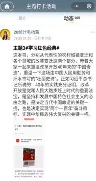 本次打卡活动历时三周,每周打卡“学习习近平总书记系列讲话”、“学习党史”、“学习红色经典”一个主题,同学们根据指定主题开展学习,并借助打卡微信小程序发布打卡内容。通过参与打卡活动,大家深受鼓舞和感染,积极分享自己的所学所思所想。