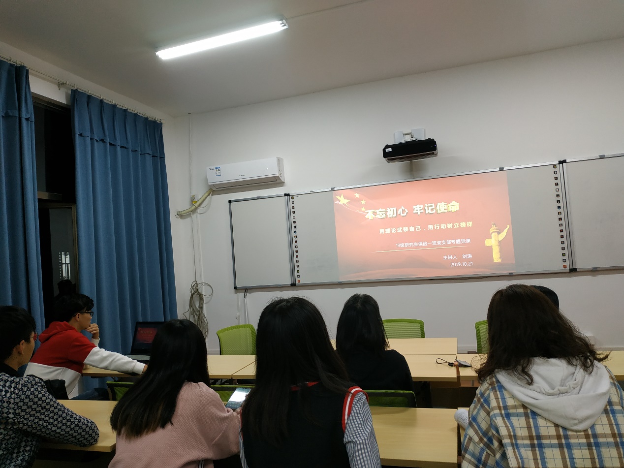 2019年10月21日晚上,ok1133诸侯快讯2019级研究生保险一班党支部在财院校区ok1133诸侯快讯310会议室开展了以“用理论武装自己,用行动树立榜样”为主题的党课活动。本次党课由支部书记刘涛主持,主要分为以下三个部分进行:党章学习,党支部工作条例学习,近期学习心得分享。