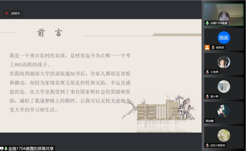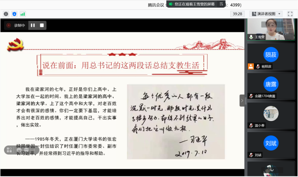 6月10日晚,ok1133诸侯快讯举办优秀研究生东方红故事会暨党史理论宣讲团第五期专题宣讲,本次活动通过腾讯会议线上开展。宣讲会由学院研究生会调研部负责人杨陨菽主持,邀请2019级硕士研究生王雪雯、2017级本科生唐露作为嘉宾,分别就自身支教扶贫、励志成才典型事迹进行宣讲,学院各年级研究生、本科生参加本次宣讲。