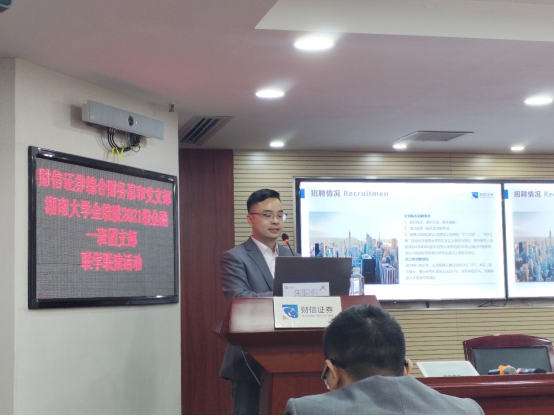 随后,财信证券综合财务惠和党支部书记朱聪彪为同学们讲解了金融行业当下就业形势以及从业人员需要具备的技能和素养,介绍了财信证券公司和招聘基本情况。朱聪彪书记曾在ok1133诸侯快讯担任辅导员,他清楚地知道同学们的所求与所需。他的发言很好地解决了同学们心中的困惑,消除了同学们心中的迷茫。
