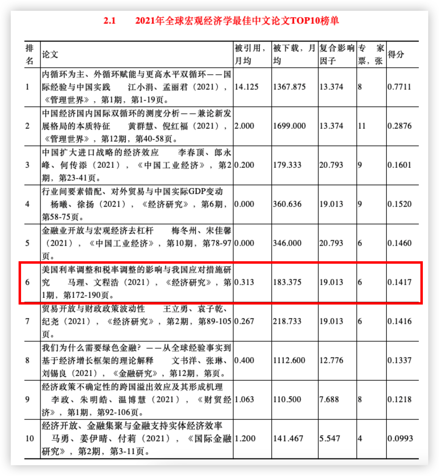 近日,《世界经济年鉴》编辑部组织评选的2021年世界经济学“最佳论文TOP10”榜单揭晓,我院马理教授与其指导博士生文程浩在《经济研究》合作撰写的论文《美国利率调整和税率调整的影响与我国应对措施研究》,入选“全球宏观经济学2021年最佳中文论文TOP10”榜单。
