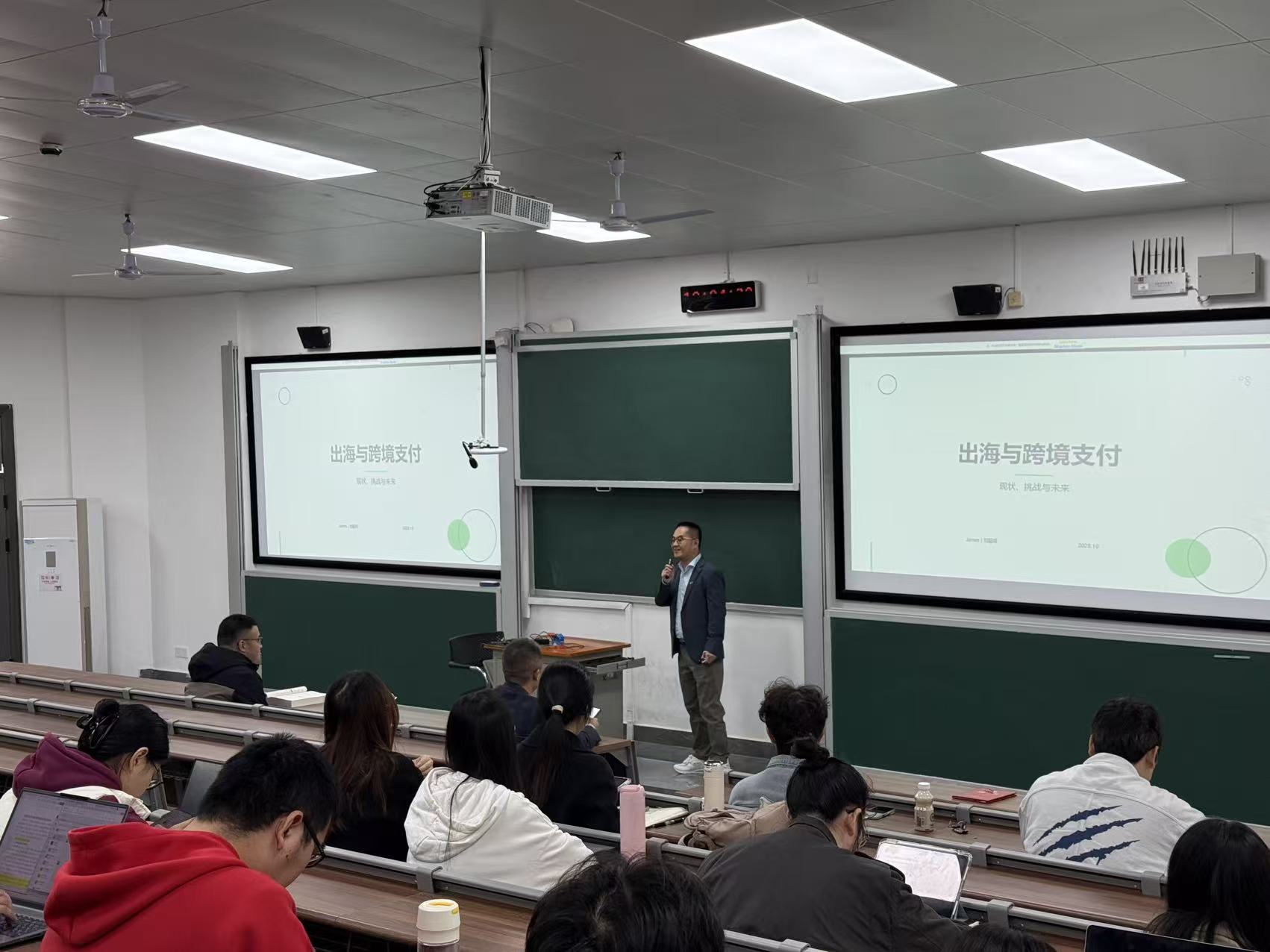 2025年11月4日上午,ok1133诸侯快讯“业界导师进课堂”系列讲座在财院校区梯教105举行。Oceanpayment联合创始人刘超峰走进金融硕士《投资学》课堂,作“出海与跨境支付:现状、挑战与未来”报告。Oceanpayment拥有全球金融业最高级别安全认证PCI DSS LEVEL 1,是中国唯一一家拥有全球数字支付技术和业务资质全牌照的FinTech公司,专注跨境⽀付技术服务与全球化布局,为中国企业出海提供安全合规的⽀付基础设施。本次授课由刘轶教授主持,一百余名研究生及部分教师现场聆听并参与交流。