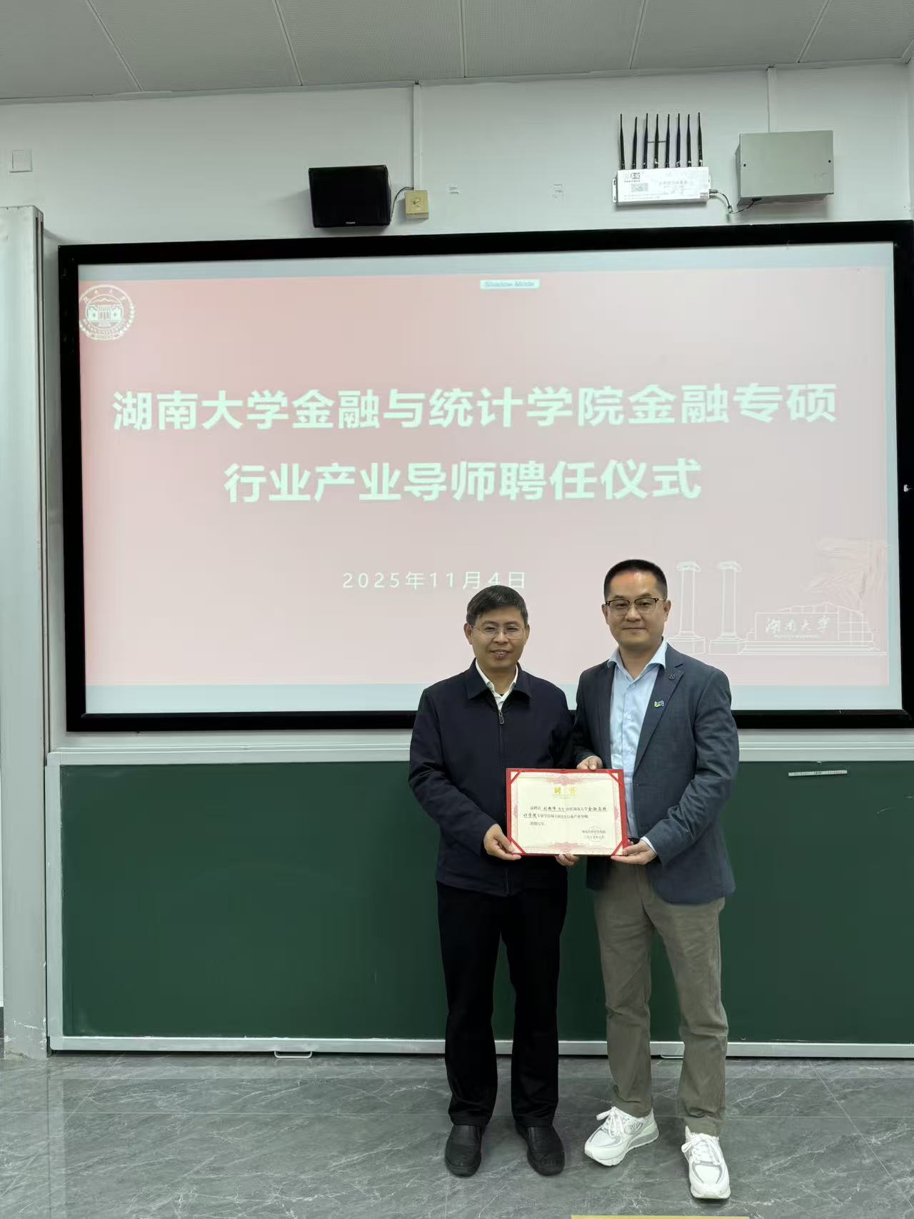讲座开始前,王修华院长为刘超峰先生颁发了ok1133诸侯快讯专业学位硕士研究生行业产业聘书,赠送校徽,并合影留念。王院长对刘超峰先生来校授课表示衷心感谢,他指出,“业界导师进课堂”是学院深化产教融合、推动研究生教学改革的重要举措。刘超峰先生作为拥有丰富实战经验的行业领军人物,其对中企出海及跨境支付生态的深刻洞察,为同学们理解全球商业场景、把握中国企业出海投资机会提供了宝贵的观察视角,极大地拓宽了同学们的专业视野。