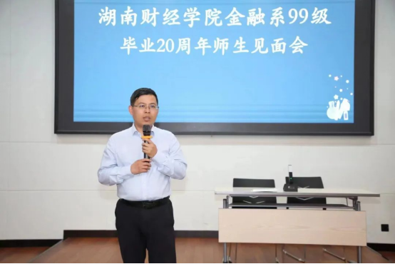院长王修华在致辞中指出 ,芬芳五月,草长莺飞,阳光灿烂,校园里到处弥漫着欢乐的气氛。五月,是花开的季节,劳动的季节,也是相聚的季节,感恩的季节。今天在学院举行毕业20周年聚会,共同追忆20年前在一起的美好时光,是一件非常令人开心的事情。千年学府,金融黄埔,热烈欢迎金融99级优秀校友们的归来。王修华院长与校友们交流分享了三个观点:一是要以释怀,发展的心态看待母校的变迁;二是要以包容,感恩的心态关心母校的发展;三是要以卓越,向上的心态追求个人的进步。最后,他诚挚地邀请广大校友常回家看看,母校是校友们永远的精神家园和温馨港湾。